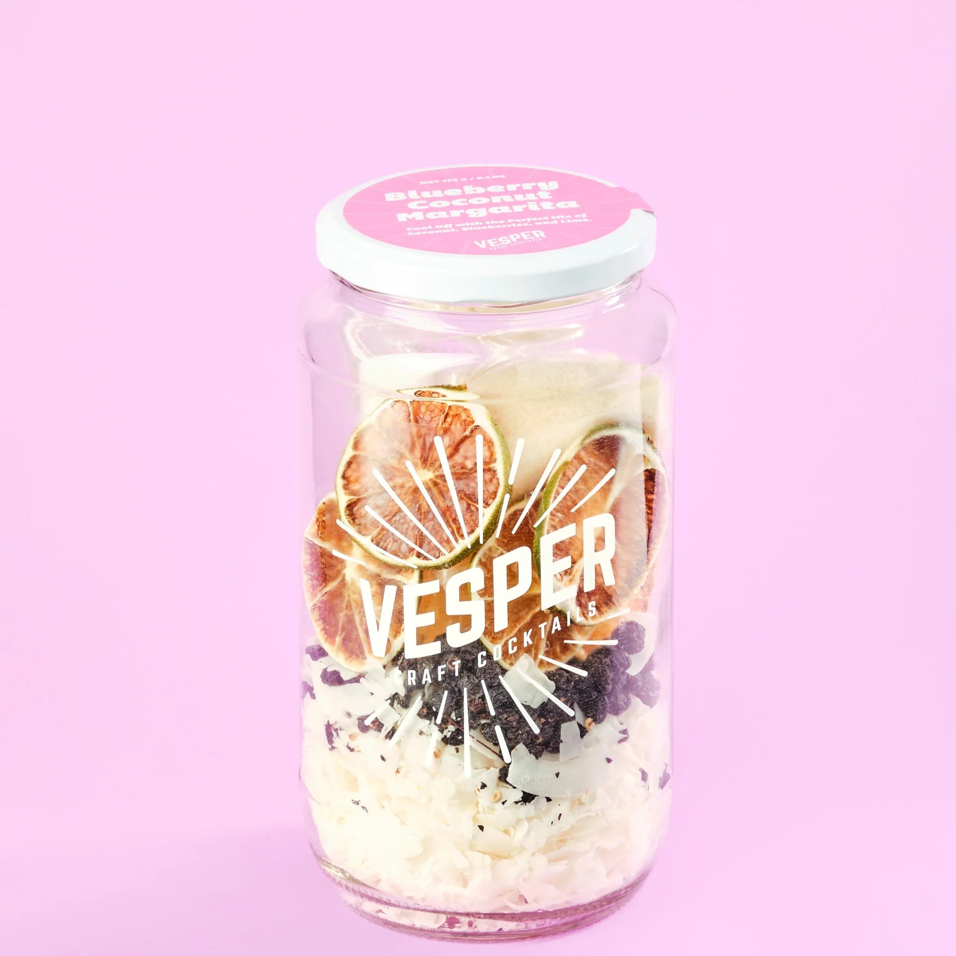 COCKTAIL KIT INCLUDES: Ready for infusion 32oz glass jar with Coconuts, Blueberries, Limes and Organic Cane Sugar.ย
