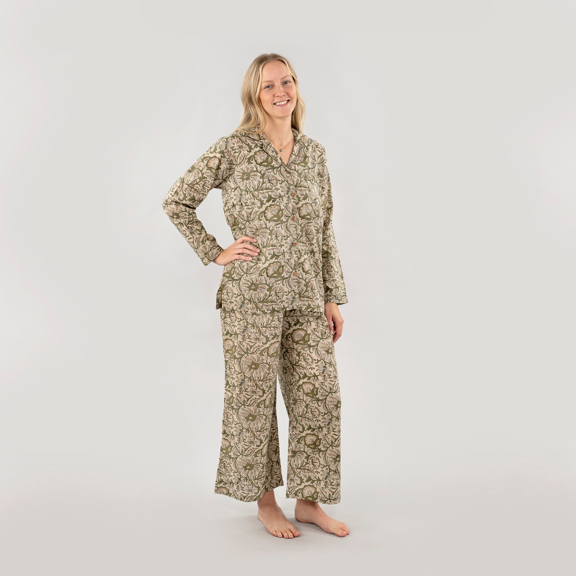 The Pallavi Block Print Pyjama Set features an elegant olive green and warm pink botanical block print motif, blending soft, earthy tones with timeless craftsmanship. Made from breathable 100% cotton and handblock printed by artisans, this set brings an elevated touch to everyday loungewear.